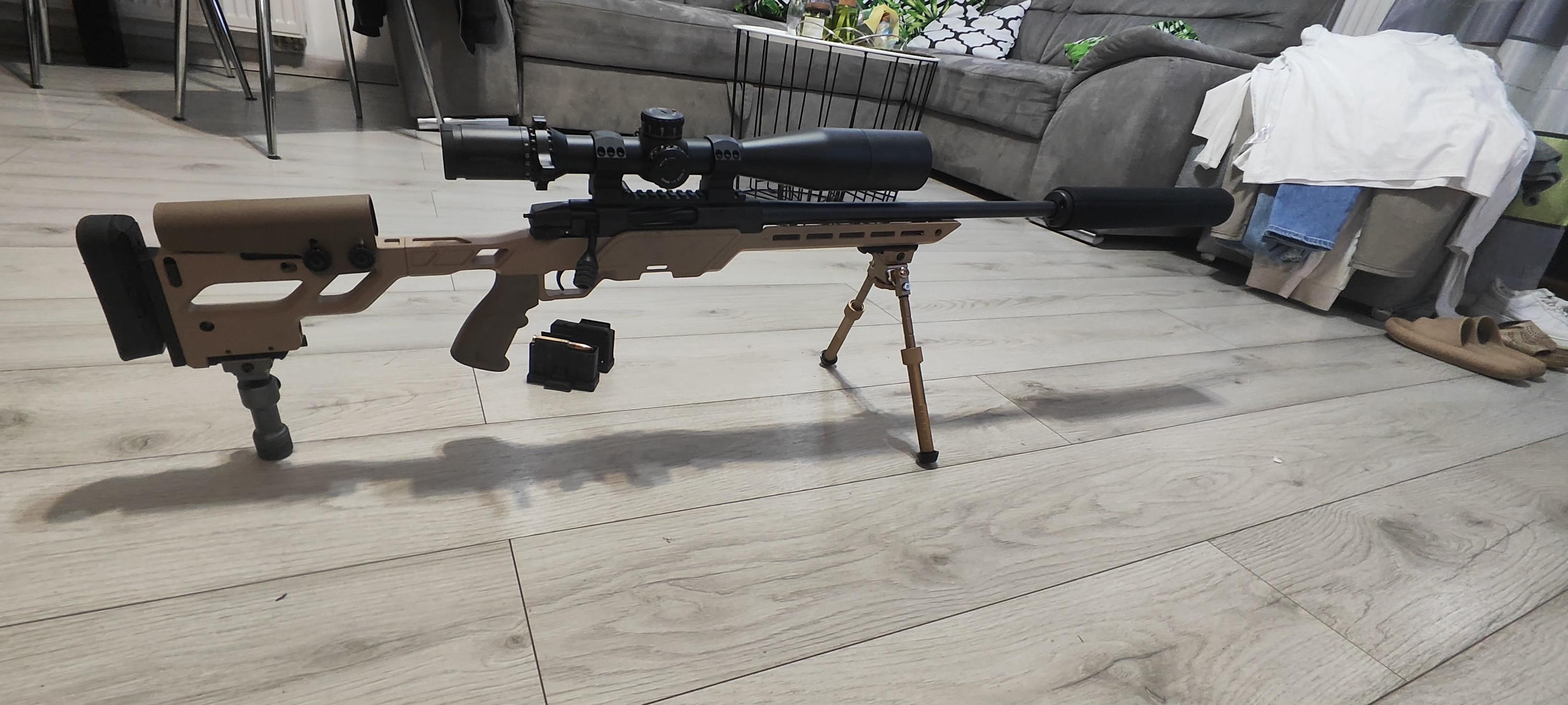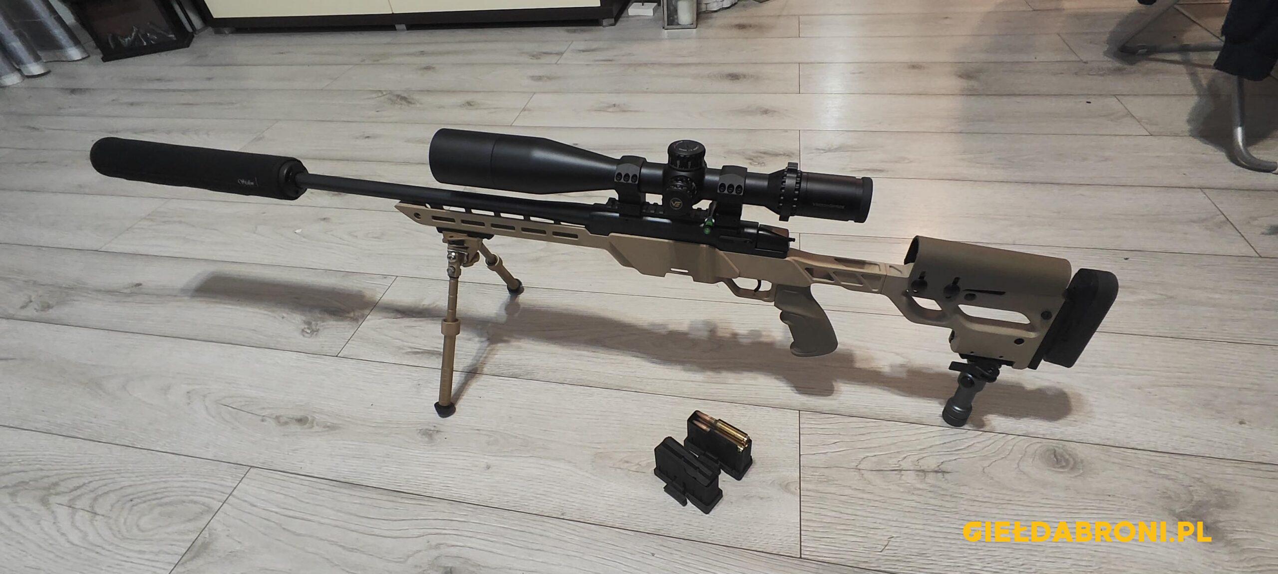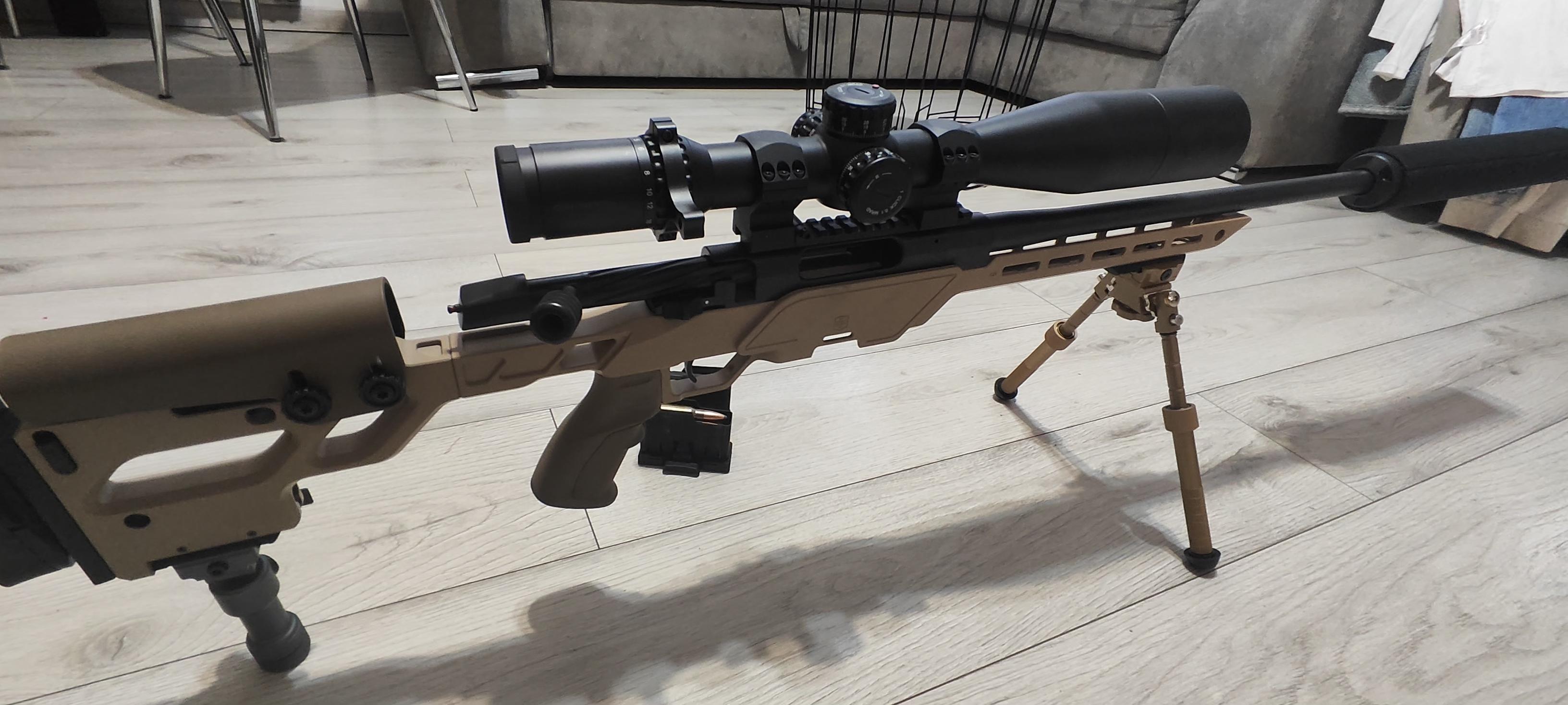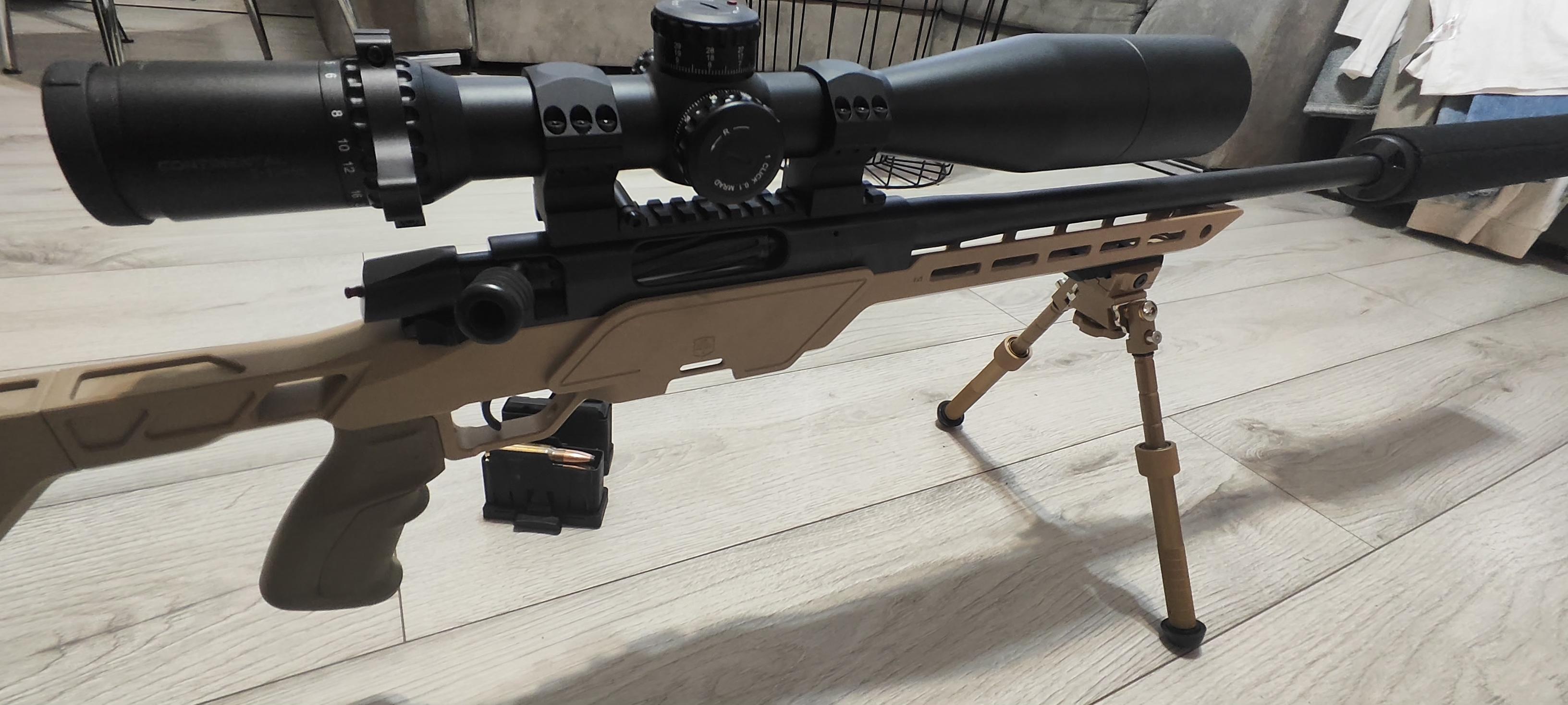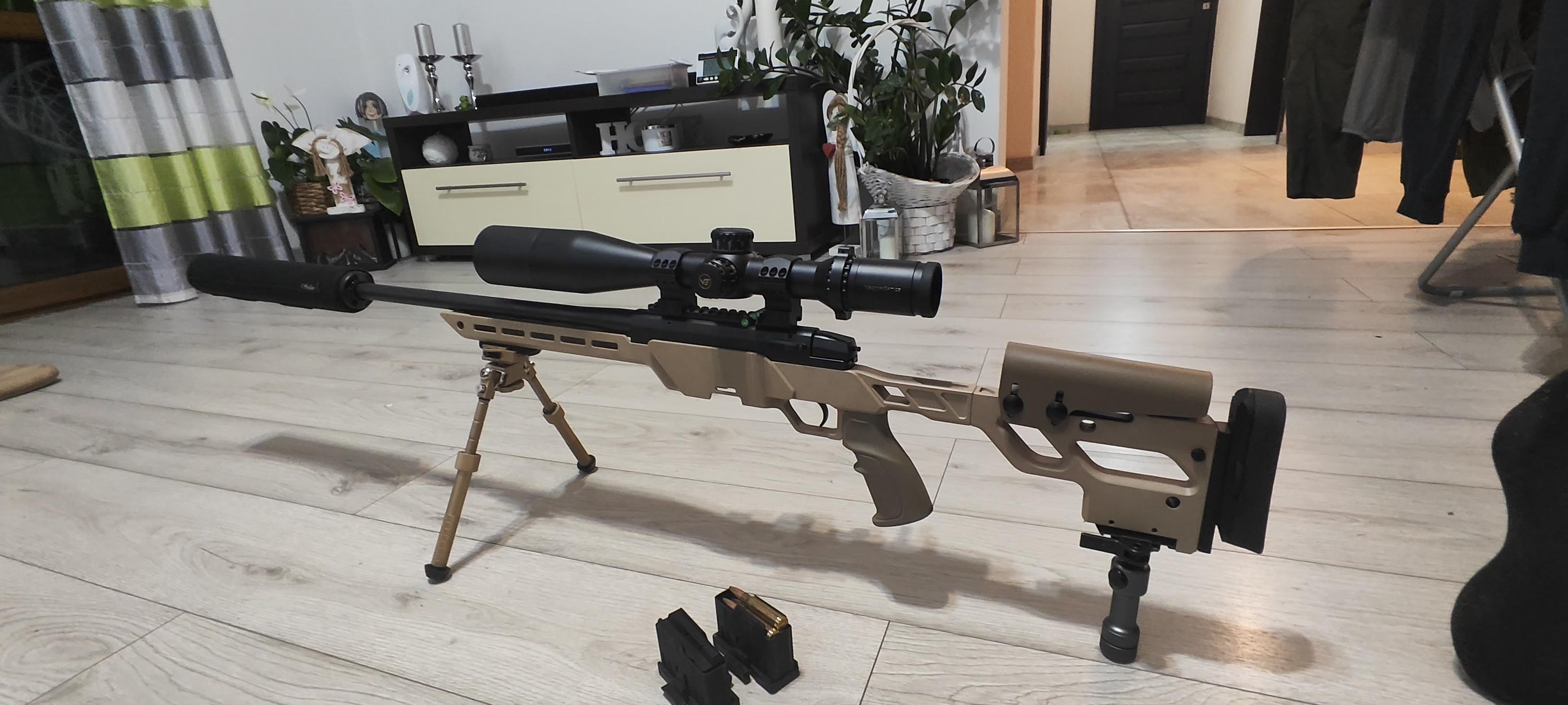 Kupiony w kwietniu 2025 r. Zastosowania: LR / trening oraz polowania — uniwersalny i bardzo precyzyjny zestaw. Do karabinu zamontowana jest ceniona luneta Vector Optics Continental 5–30×56 FFP (SFP/30, tubus 34 mm). W zestawie również tłumik STALON XE149, znacząco redukujący odrzut i hałas. W komplecie dwójnóg i monopod (widoczne na zdjęciach).