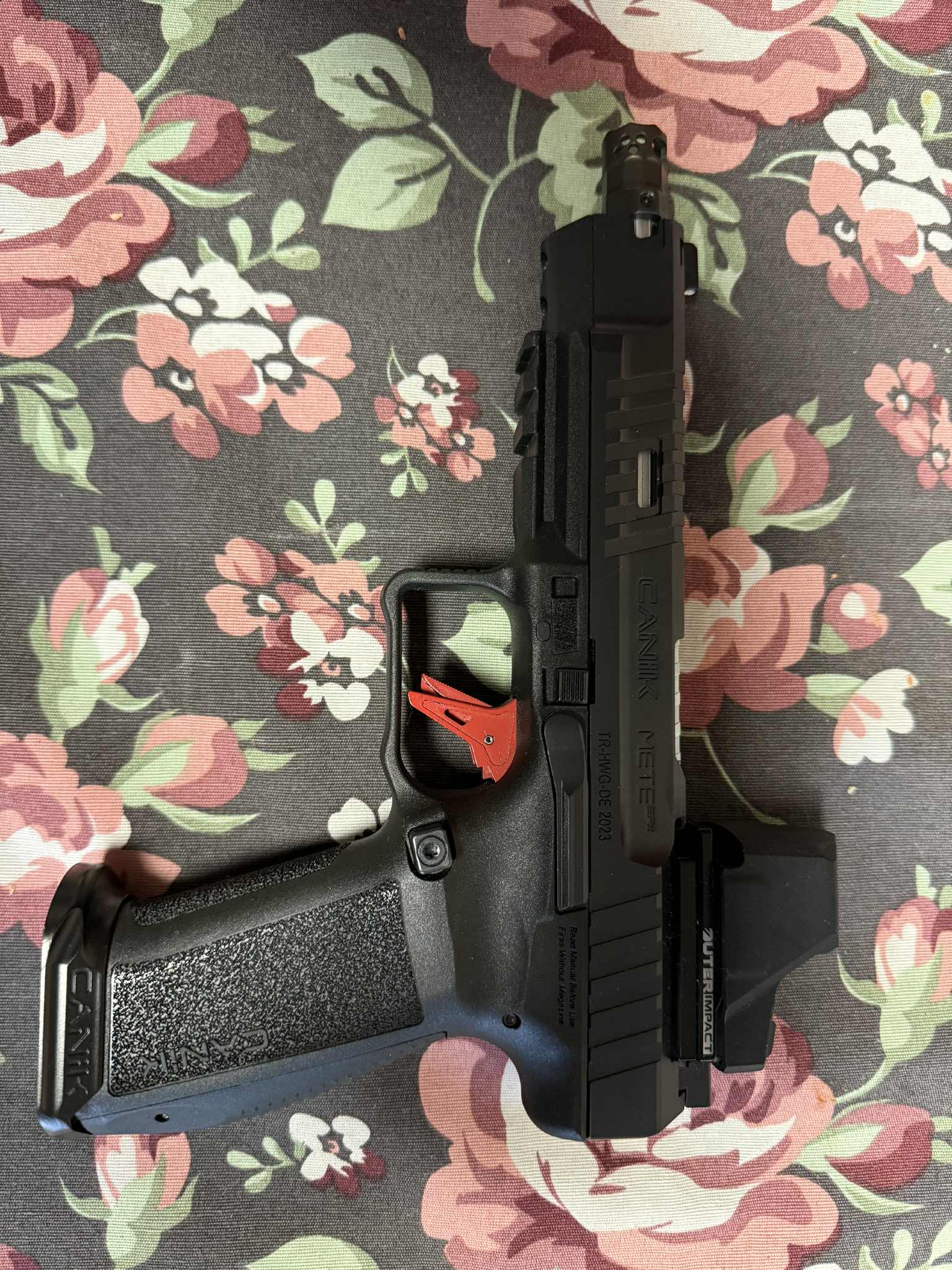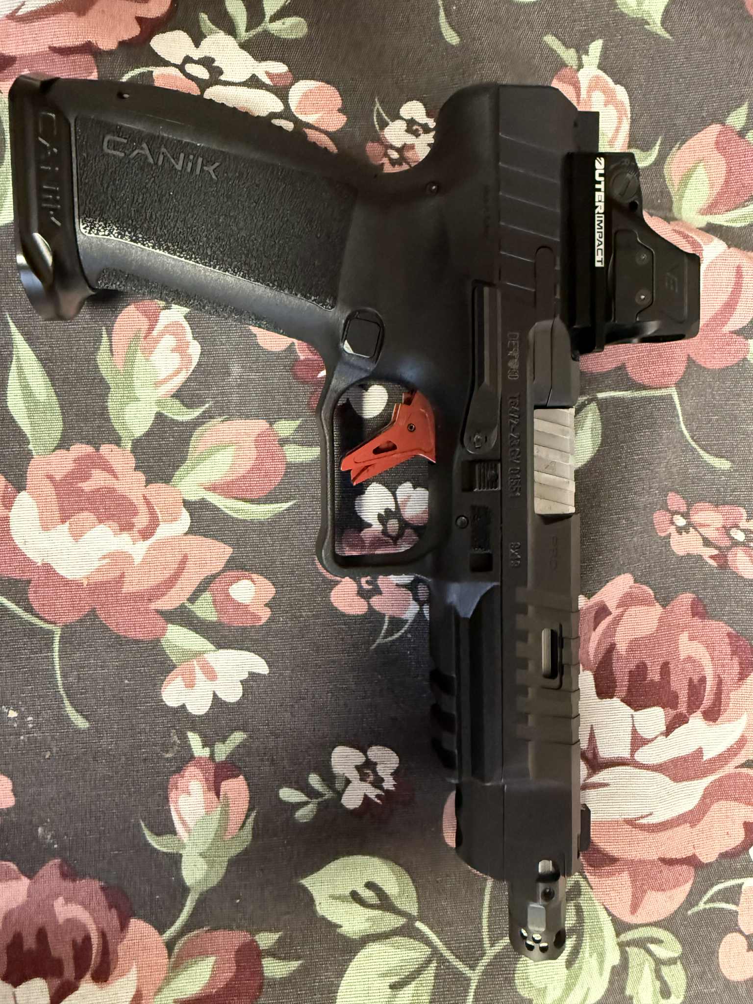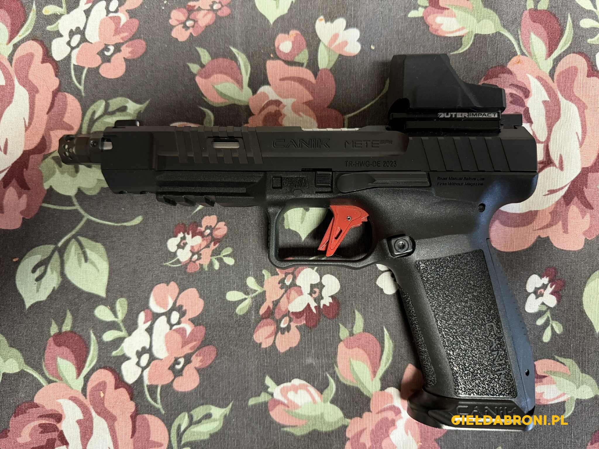 Do tego kolimator Vector Optics – Kolimator Frenzy-X 1x19x26 MRS GenII Multi-Reticle Weaver wartości 800pln, płytka do niego Outerimpact – 60$, spust płaski – 300pln, Urządzenie wylotowe TC Gear Gunfighter – 400pln. Przy cenie broni 3200 pln wartość kompletu – 4900pln. Strzelane niewiele, może z 300 kulek, pistolet miał byc zapasowy, ale nigdy sie nie przydał. Świetny zestaw, polecam.