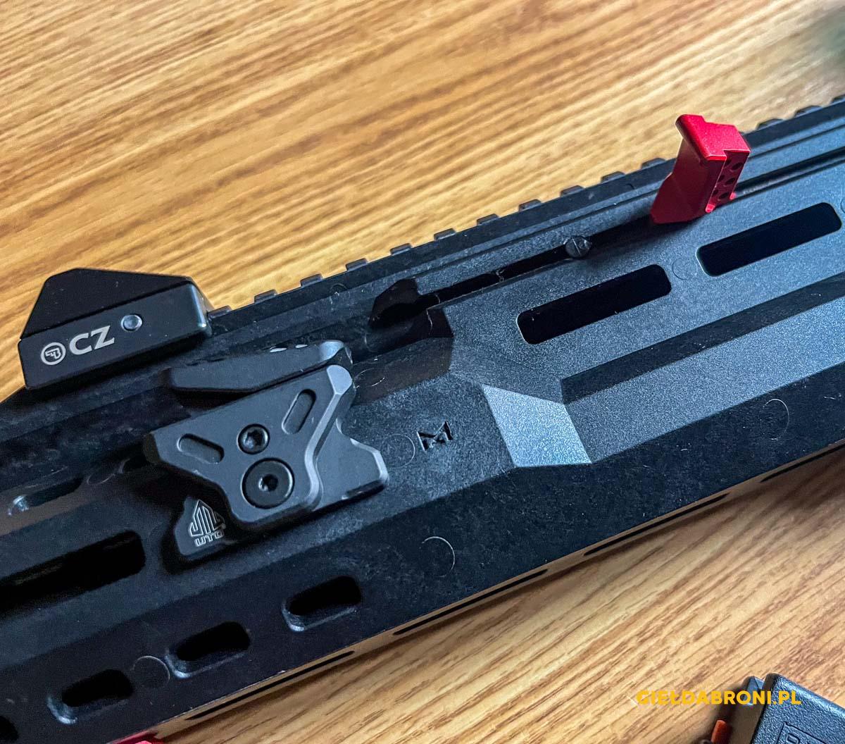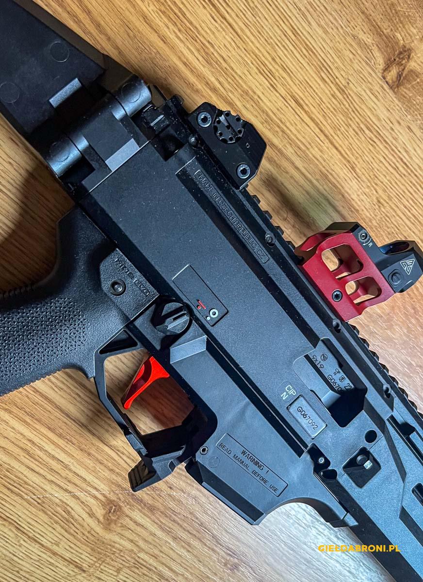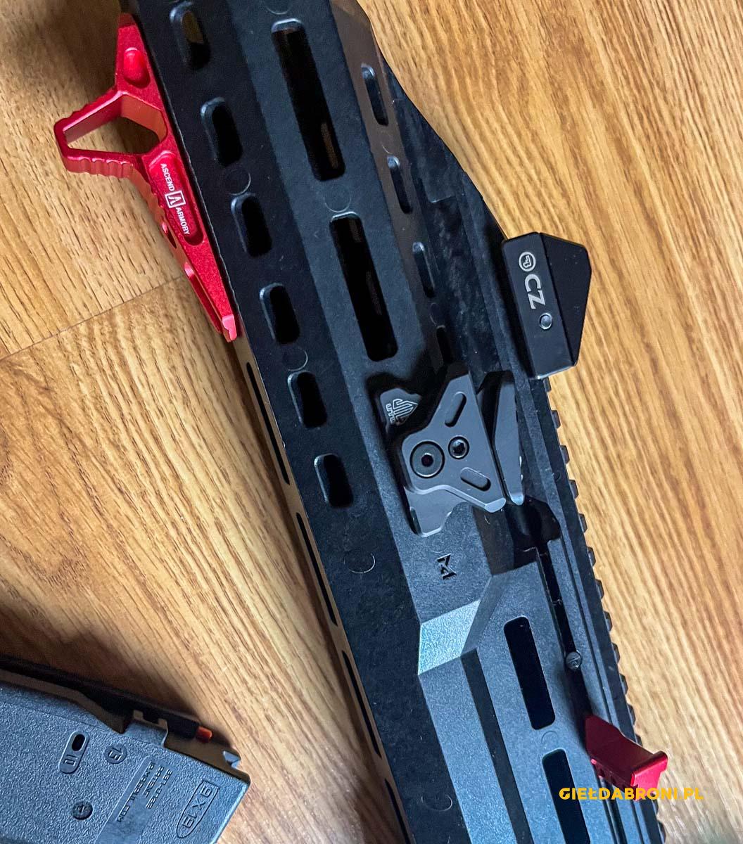 Karabinek ma zmieniony chwyt pistoletowy na bardziej prosty, wymieniony język spustowy i zestaw sprężyn. Strzela się z niego bardzo przyjemnie. Dołożona jest podstawka pod kciuk lewej ręki, założony jest aluminiowy, powiększony uchwyt do przeładowania broni. Założona jest mocniejsza sprężyna na zamku. Wymieniony bezpiecznik na mniejszy z prawej strony. Wymieniony zrzut magazynka na większy. W zestawie są cztery magazynki w tym jeden 20 i jeden 30 nabojowy. Do zestawu dokładam wszystkie oryginalne części. Kolimator nie wchodzi w cenę zestawu!
