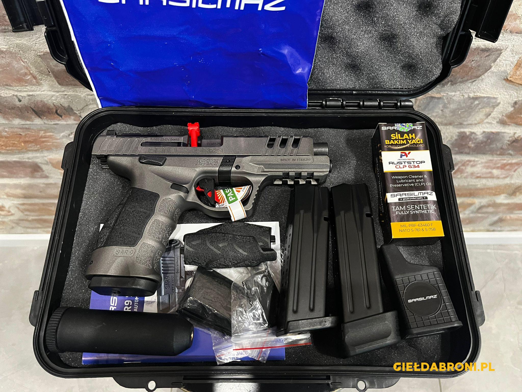 Pistolet Sarsilmaz SAR9 Platinium Gen 3 kal. 9×19. Pistolet wyposażony w bezpiecznik zamka oraz spustu. Chwyt z wymiennymi okładkami (z tyłu i po bokach) pozwala w pełni dostosować go do dłoni strzelca. SAR9 Gen 3 jest standardowo wyposażony w klasyczne celowniki trójpunktowe i szynę Picatinny do montażu dowolnego oświetlenia.  Możliwość montażu kolimatora. W zestawie: walizka, 2x magazynki 17nb + 18nb, szybkoładowacz, olej, wycior. Broń nowa. Produkt koncesjonowany, dostępny za okazaniem odpowiednich dokumentów. Tel. kontakt 737 396 130 lub przez guns-ammo.pl