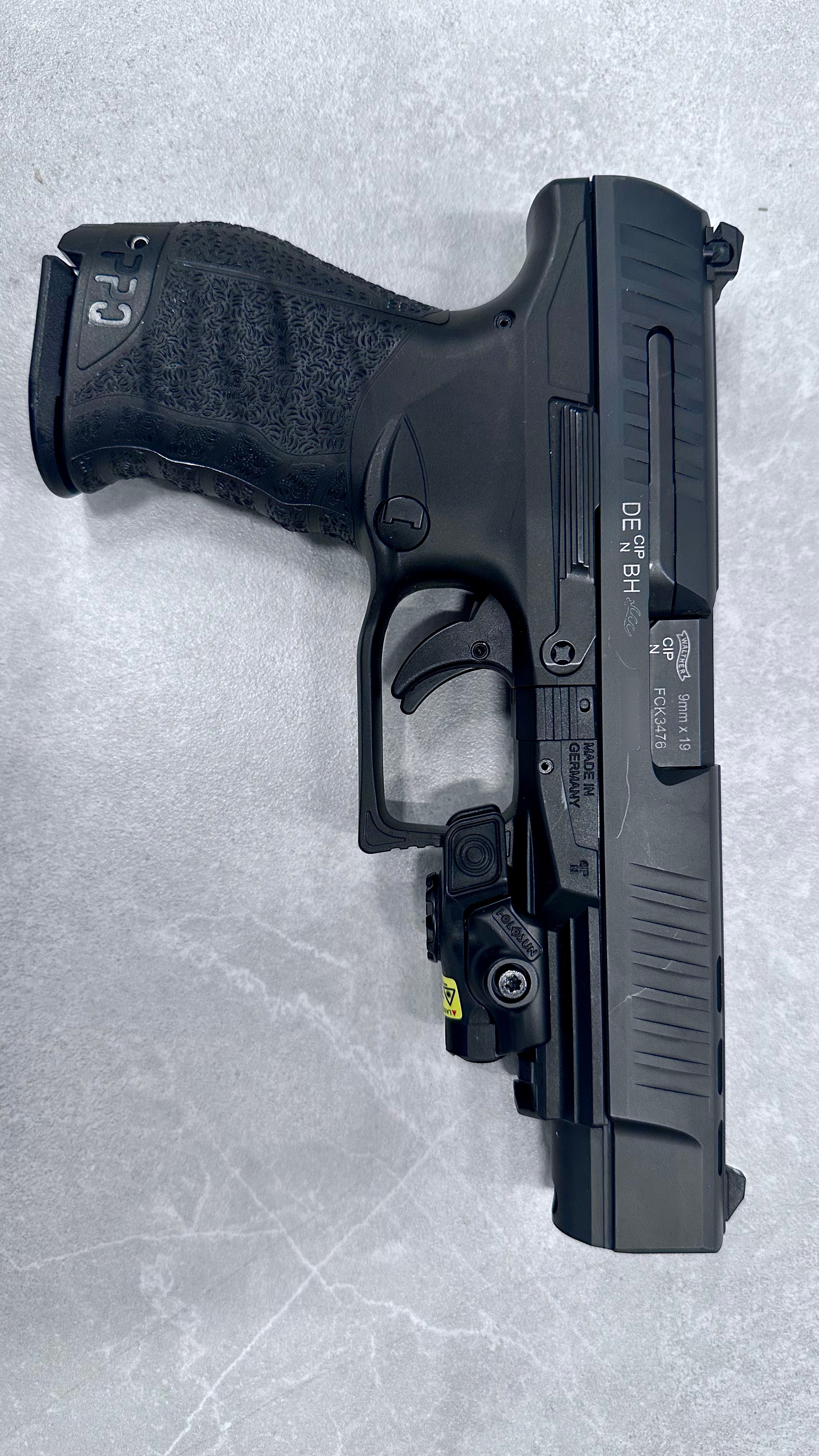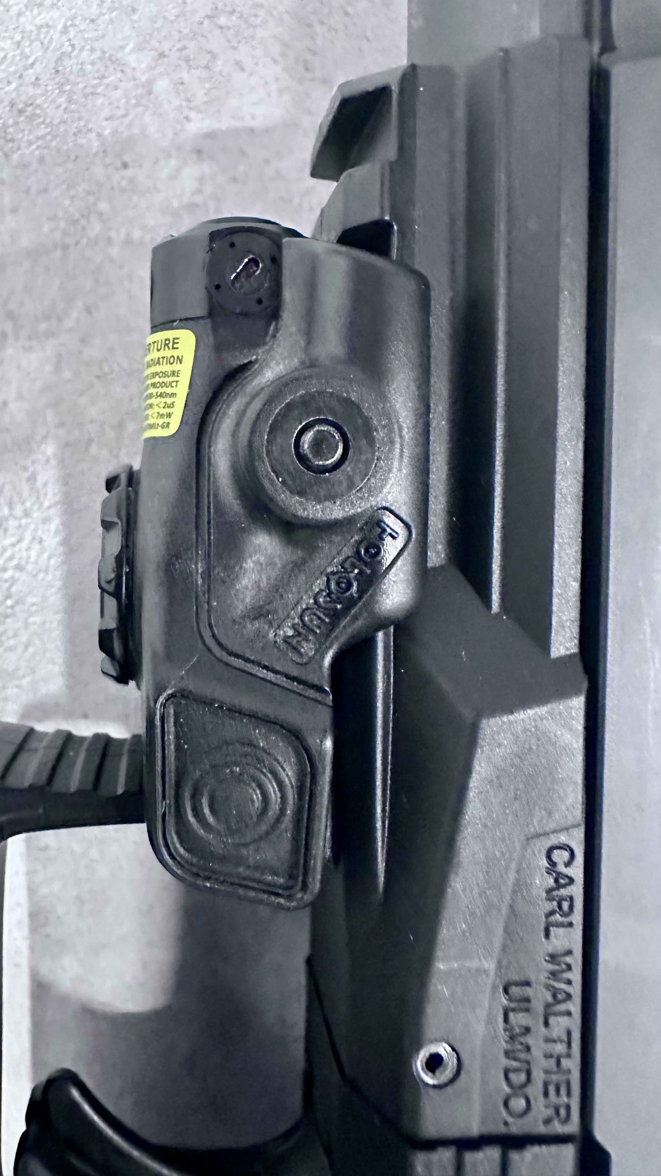 Egzemplarz wyposażony w akcesorium Holosun montowane na szynie (laser/akcesorium celownicze).