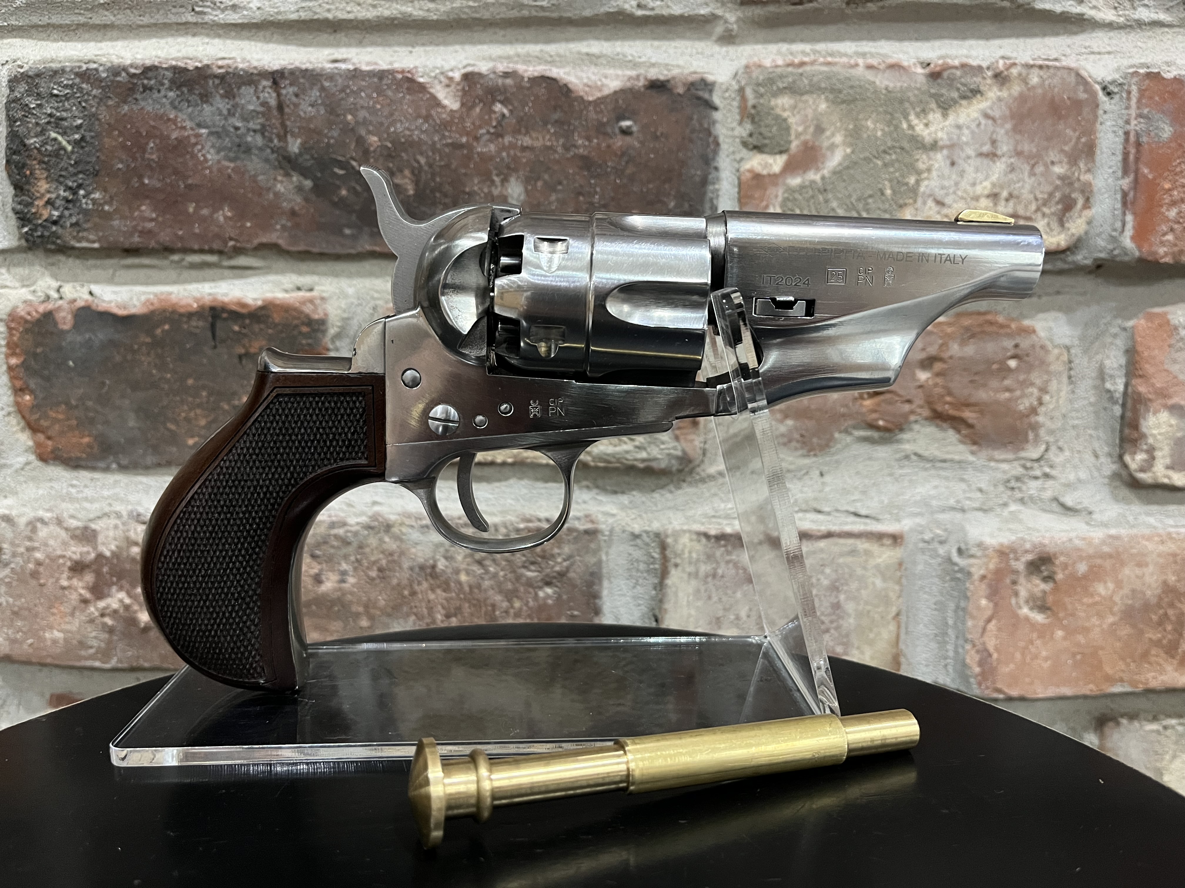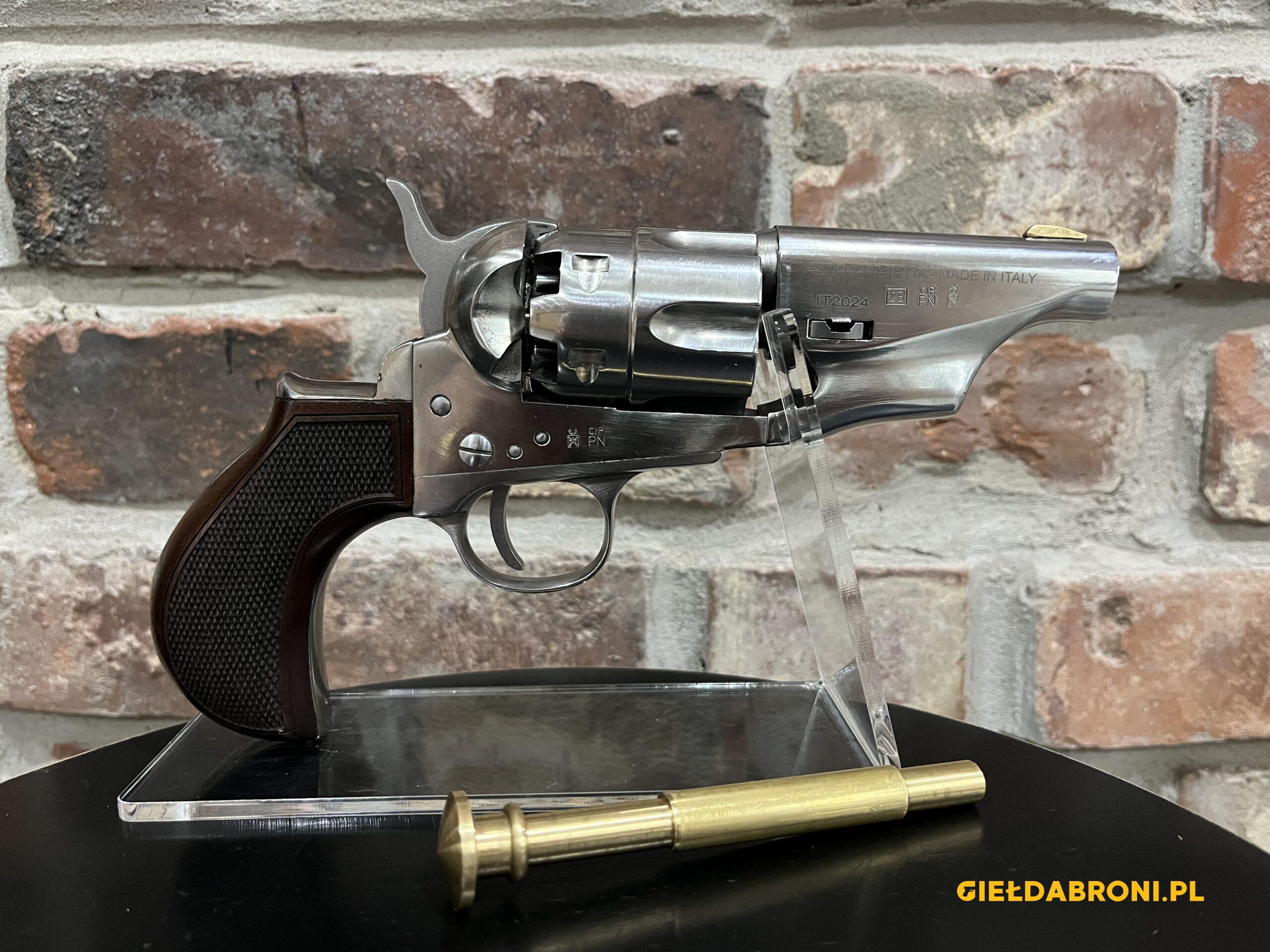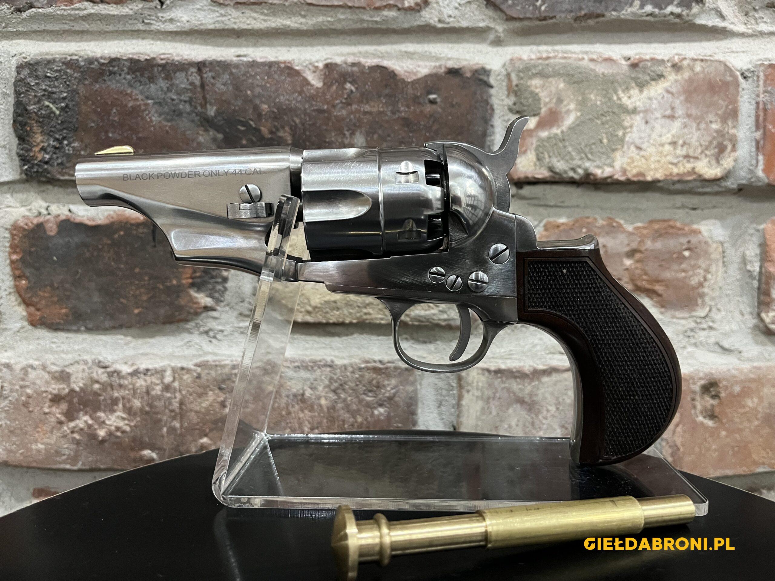 Rewolwer czarnoprochowy 1862 Colt Police Snubnose Thunderer Steel Old Silver (CPPSNBOS44MTLC) Pietta kal. 44 z lufą długości 3″. Produkt nowy. Dostępne inne rewolwery oraz akcesoria czarnoprochowe łącznie z czarnym prochem (w przypadku czarnego prochu wymagana EKB). Ogłoszenie ma charakter informacyjny, sprzedajemy tylko i wyłącznie stacjonarnie osobom pełnoletnim, możliwa telefoniczna rezerwacja. Cały asortyment widoczny na stronie guns-ammo.pl. W myśl art. 11 ust. 10 ustawy o broni i amunicji nie wymaga pozwolenia na broń posiadanie broni palnej rozdzielnego ładowania wytworzonej przed 1885r bądź jej repliki.