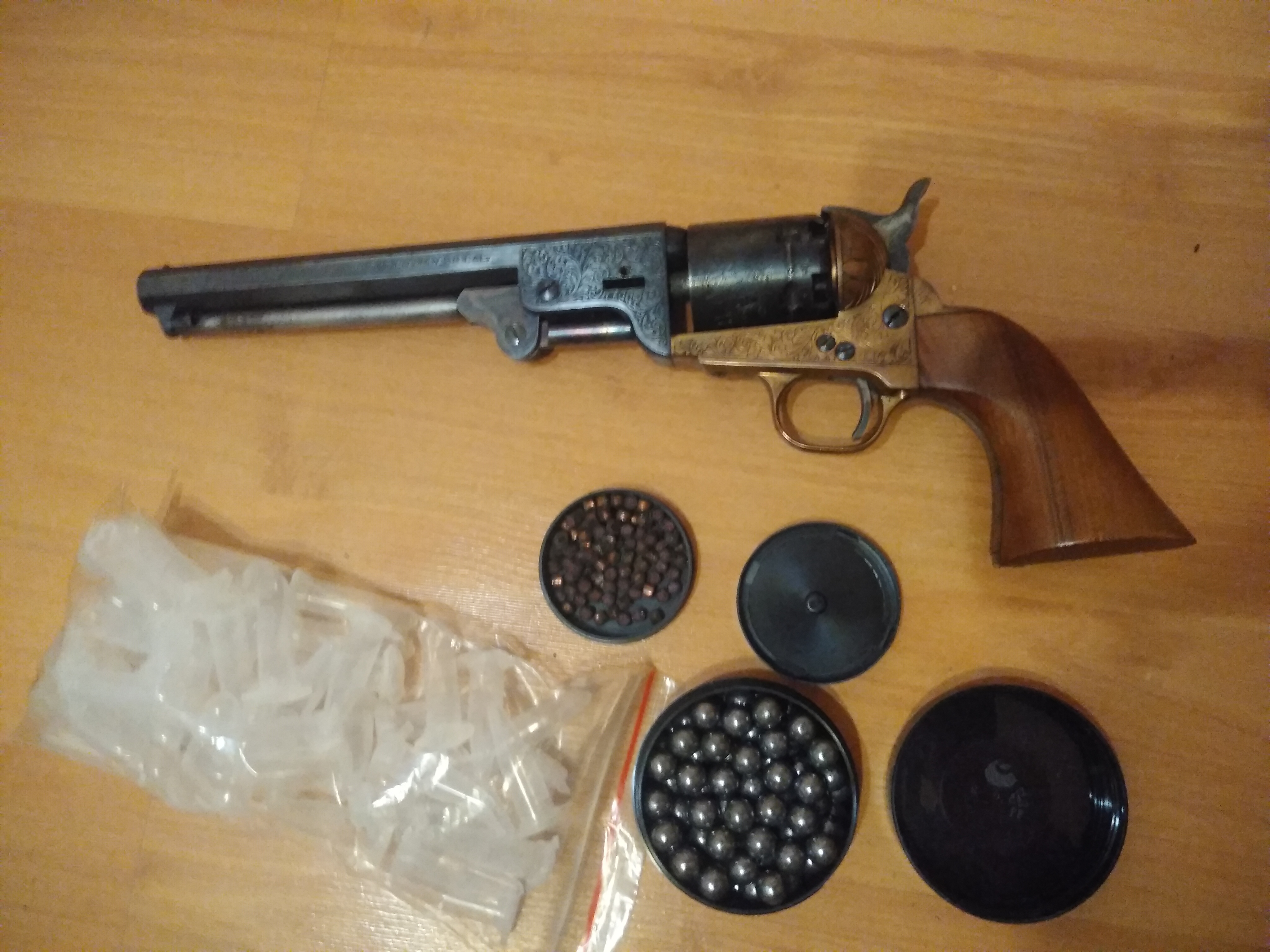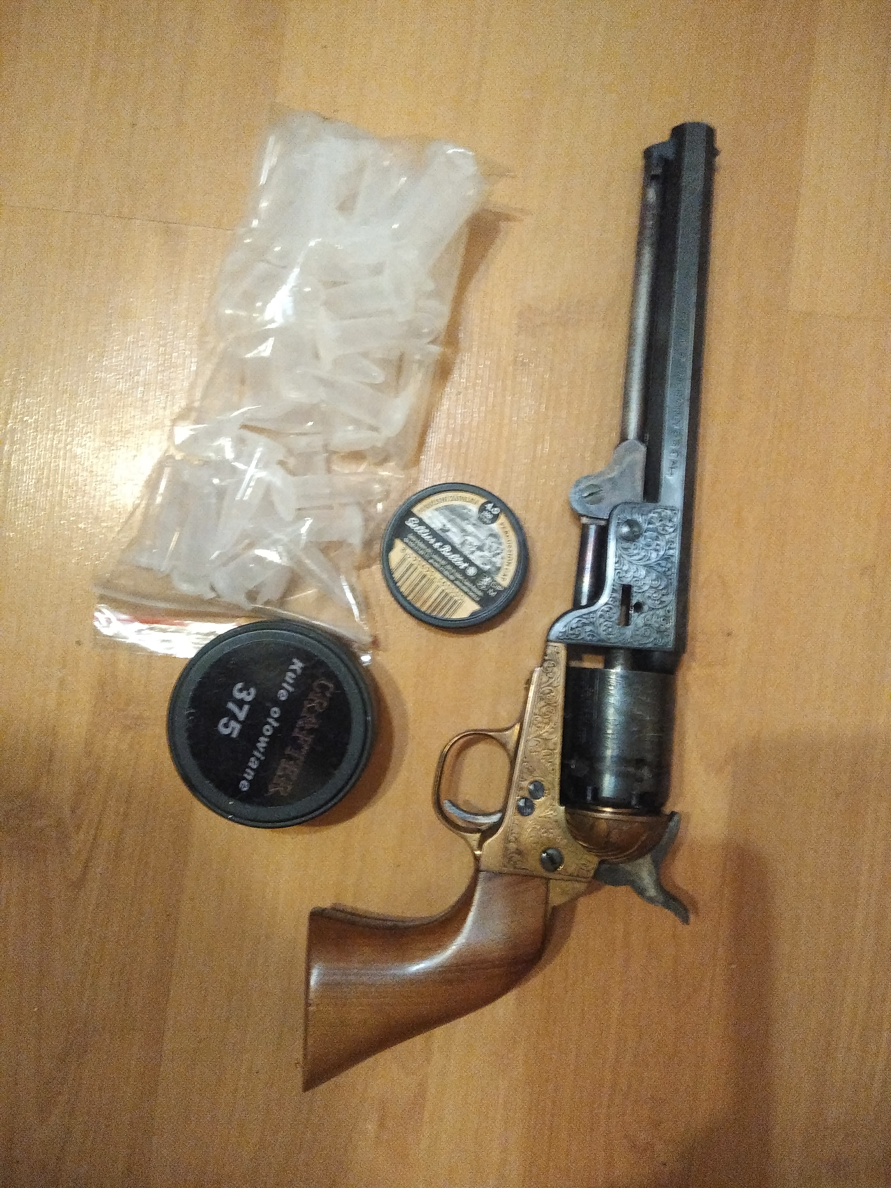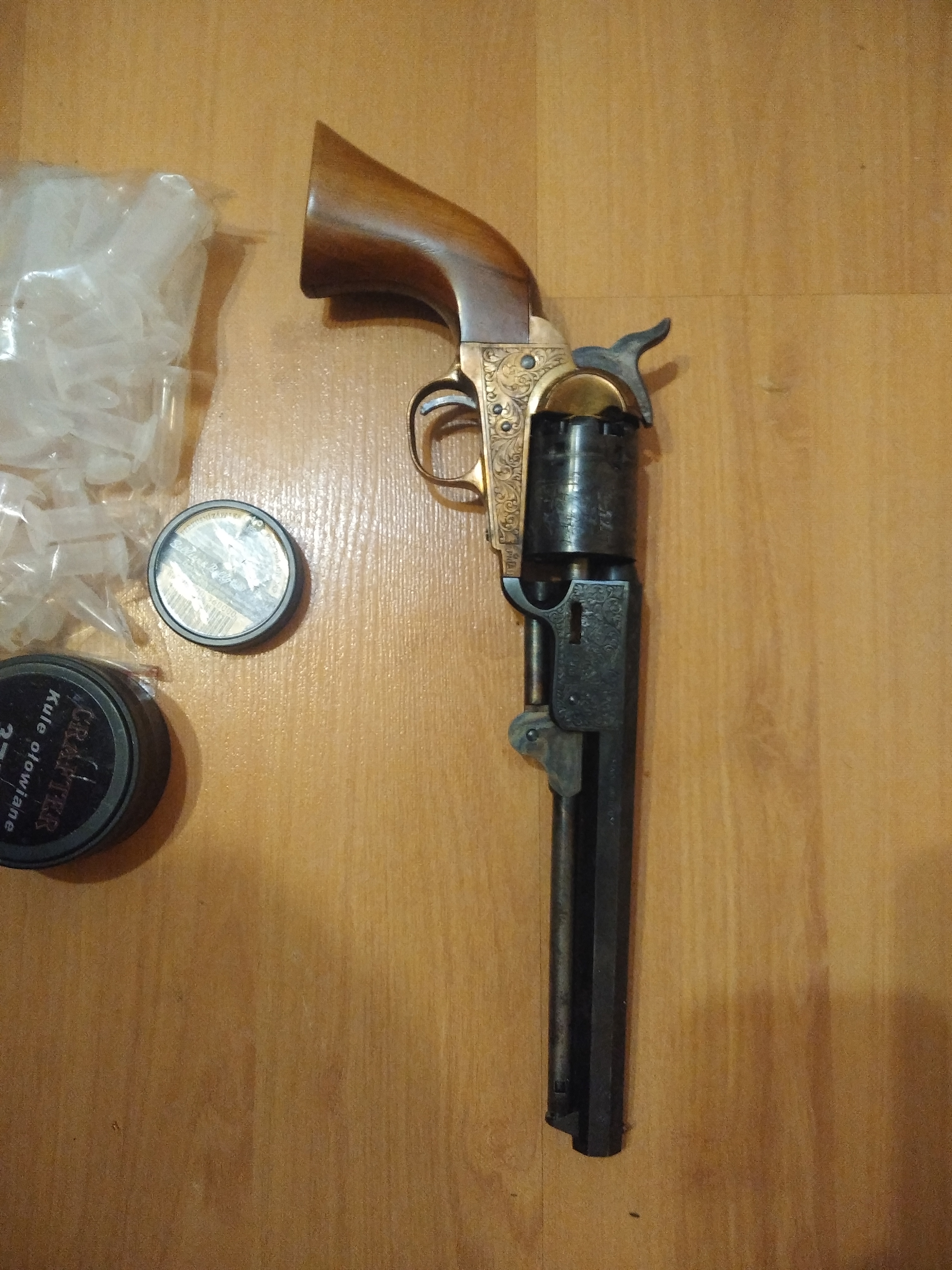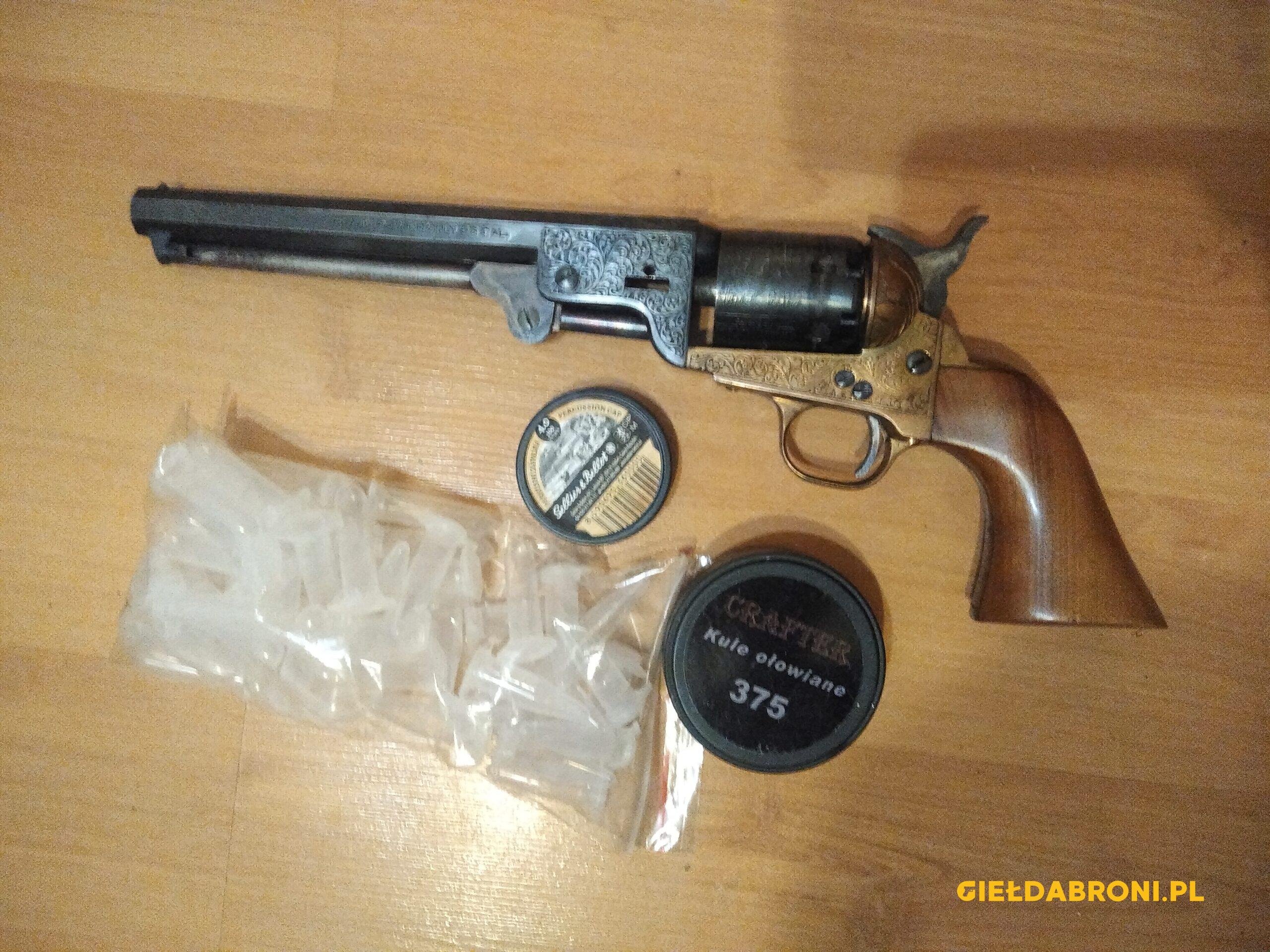 rewolwer czarnoprochowy cal36 bez zezwolenia (proszę mi nie wysyłać żadnego dowodu tożsamości) jestem pierwszym właścicielem, rewolwer posiadam od ponad roku, strzelałem z niego parę razy. rewolwer jest w bardzo dobrym stanie i nie nosi śladów użytkowania, regularnie był czyszczony, aby zapobiec korozji spowodowanej produktami spalania czarnego prochu. do rewolweru dorzucam kule ołowiane 365., próbówki do prochu i kapiszony. w razie pytań proszę dzwonić na tel.502151295