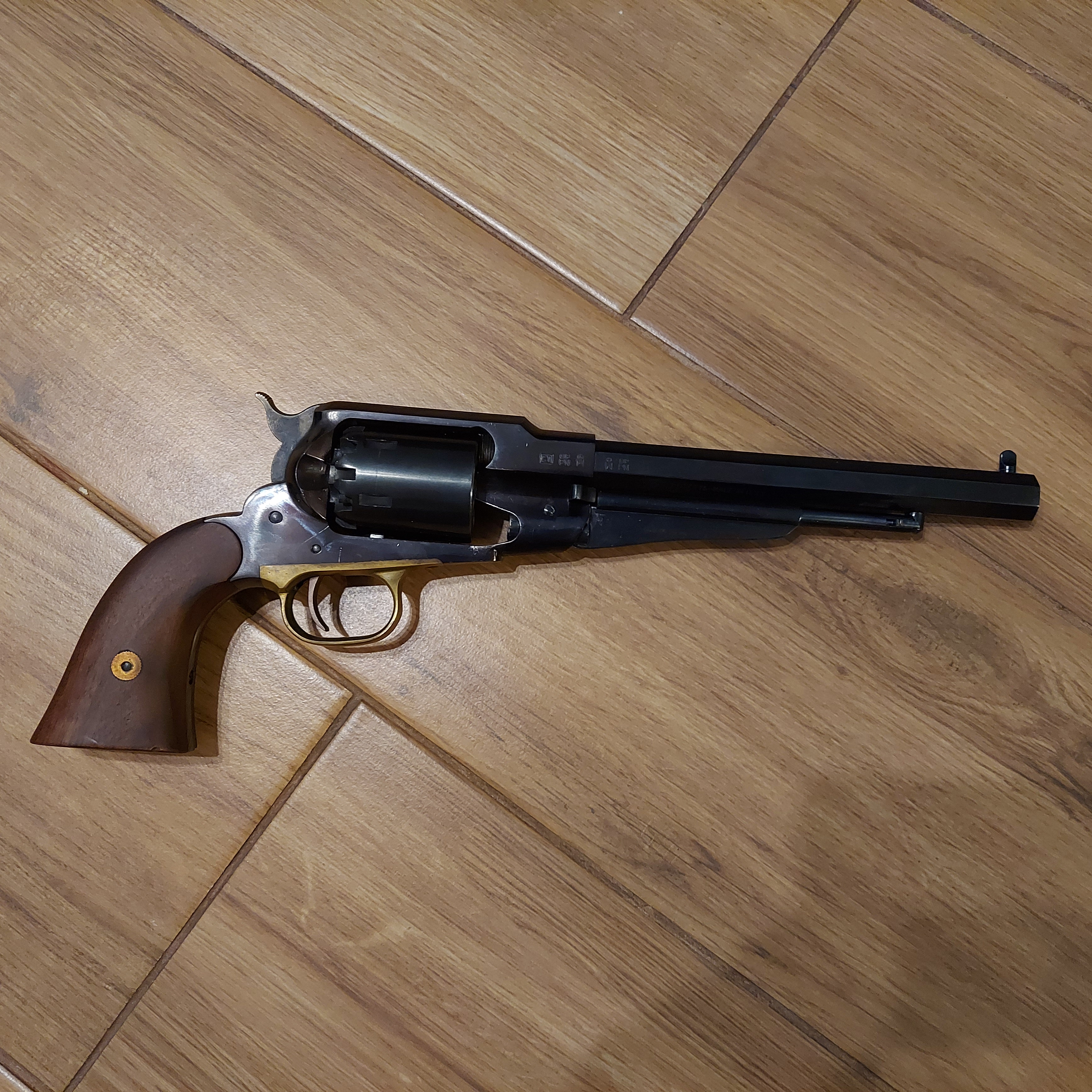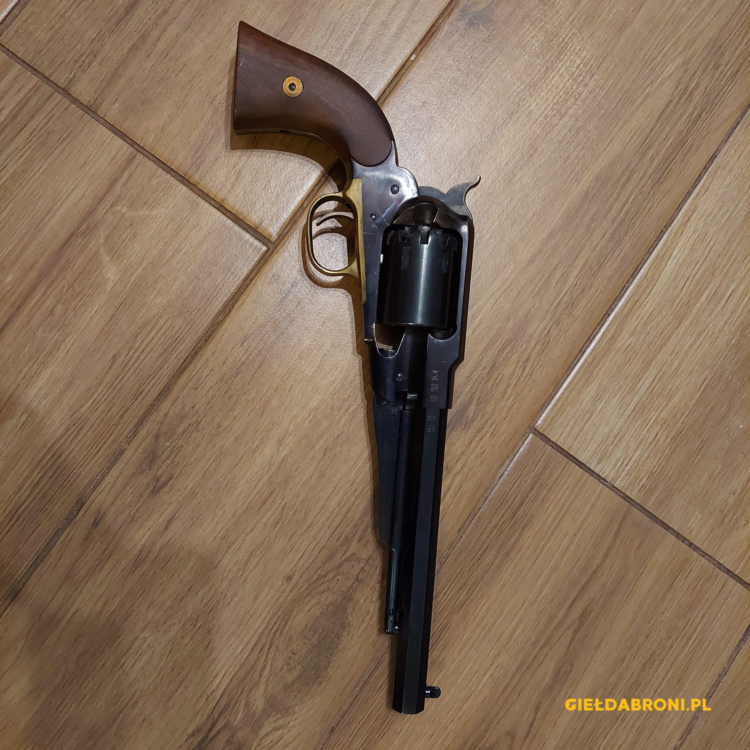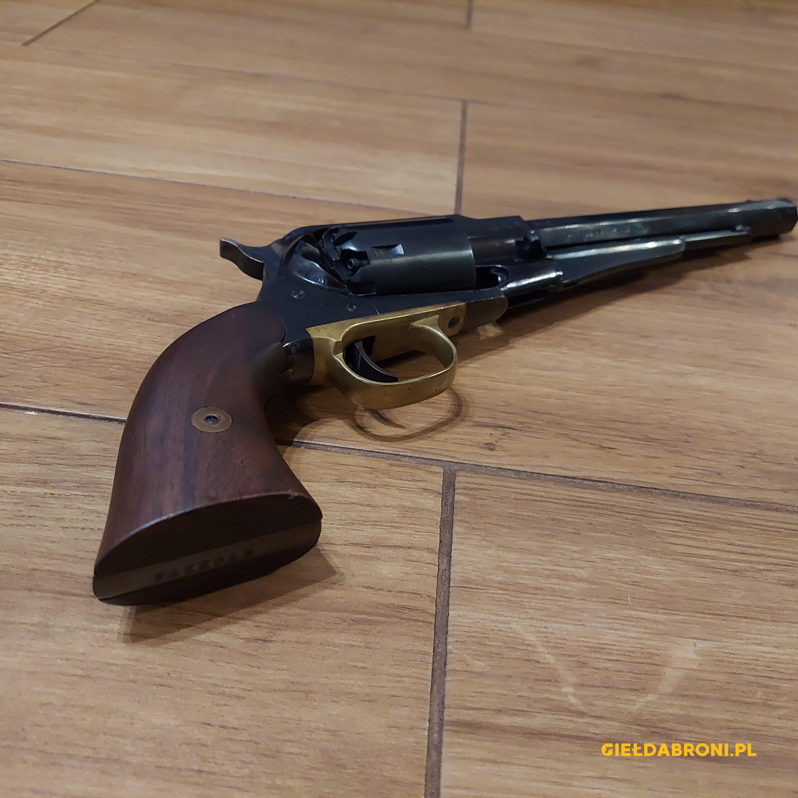 Remington Pietta posiada całkowitą długość 14,6″ (370.84mm). Rewolwer w całości, poza kabłąkiem spustu wykończony jest czarną oksydą.